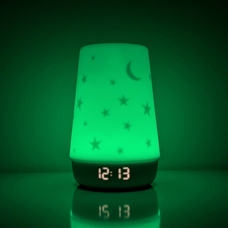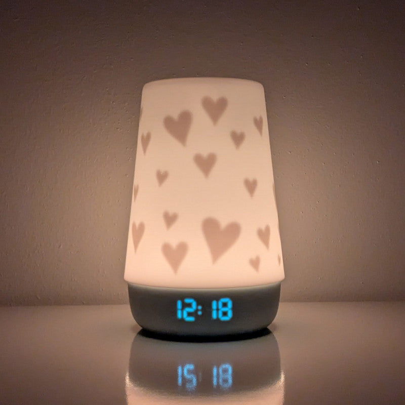 This shell-like cover is white and opaque, maintaining the clean, minimal aesthetics of the Rest lamp. Once turned on, the Rest's colors show through and reveal a stars and moon or hearts theme, along with their name (or other personalized message of up to 10 letters).
