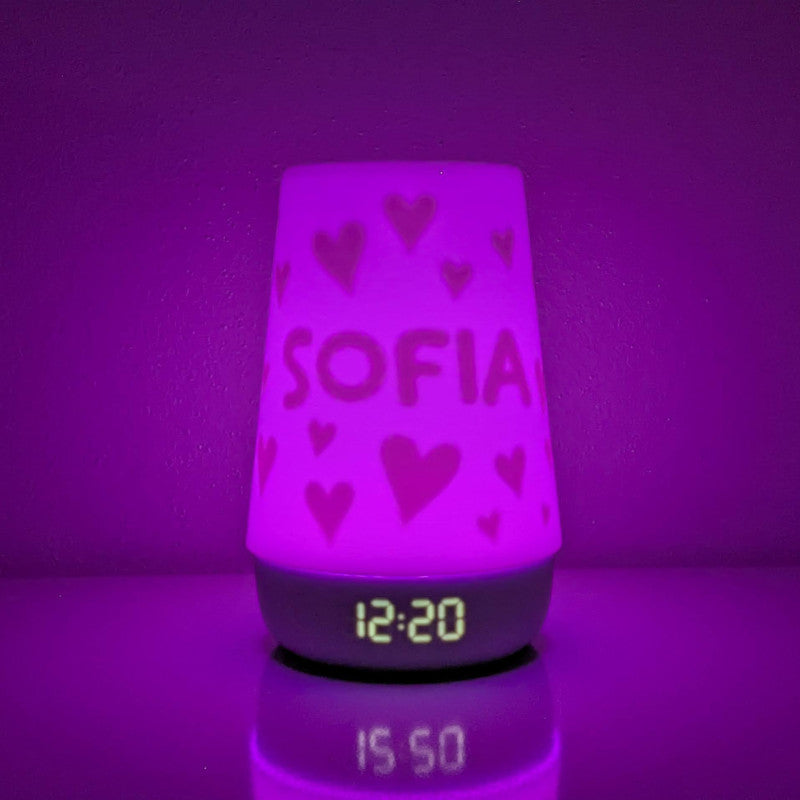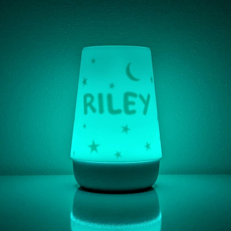 This shell-like cover is white and opaque, maintaining the clean, minimal aesthetics of the Rest lamp. Once turned on, the Rest's colors show through and reveal a stars and moon or hearts theme, along with their name (or other personalized message of up to 10 letters).